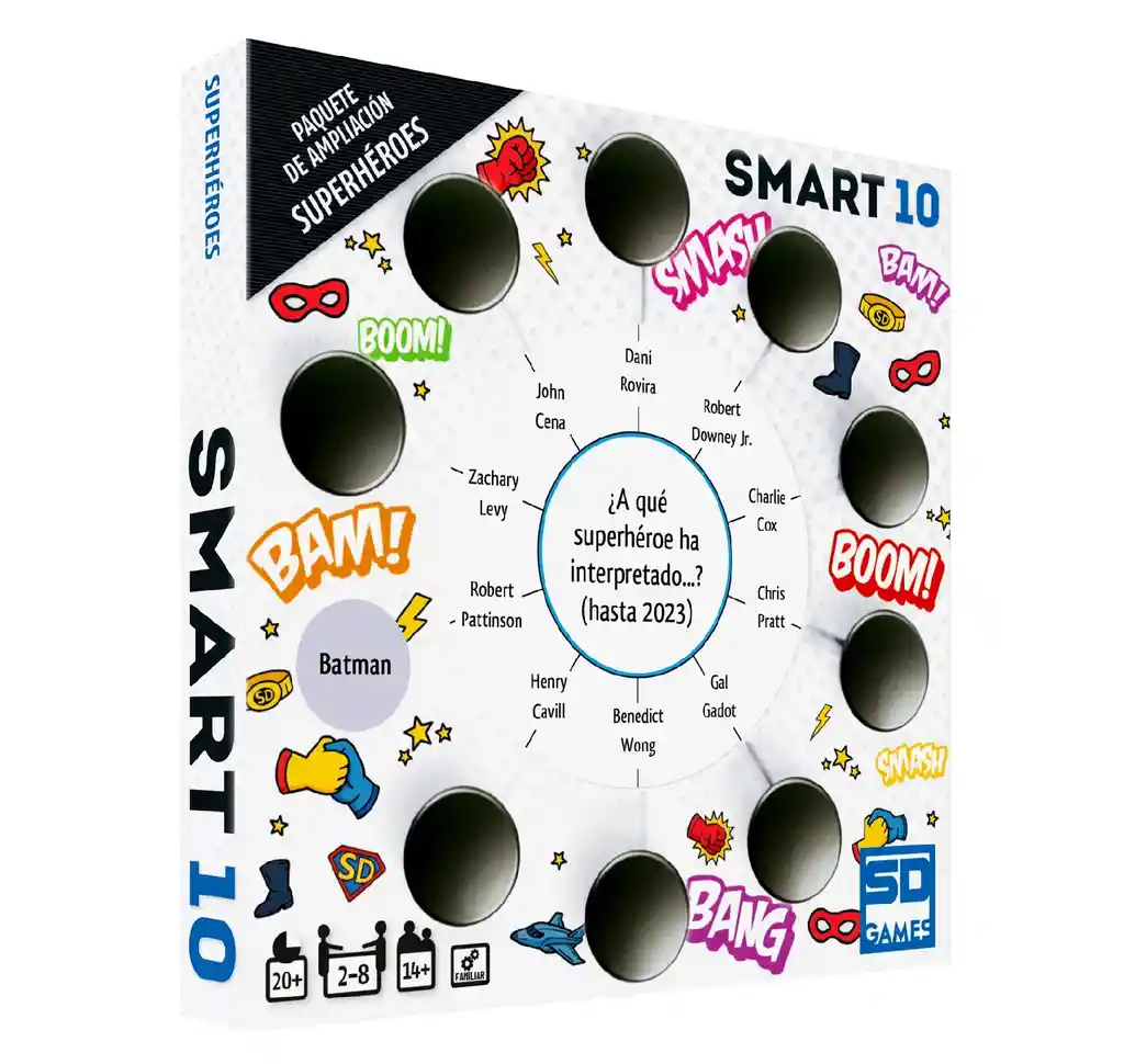 Juego de Mesa Smart 10: Superhéroes Calificación BGG: 7.2 REQUIERES DEL JUEGO BASE SMART 10 PARA PODER JUGAR ESTA EXPANSIÓN ¡Un nuevo conjunto de tarjetas de preguntas para el juego SMART 10! Esta expansión temática está centrada en el emocionante mundo de los superhéroes. Contiene 50 tarjetas de doble cara con 100 nuevas preguntas y 1000 nuevas respuestas. Puedes reemplazar las tarjetas de preguntas en la caja Smart con dos paquetes de ampliación temáticos o mezclar estas preguntas de superhéroes con la mitad de las tarjetas originales. Para poder usar estas preguntas, se requiere tener la caja Smart incluida en cualquier juego base de Smart 10. • Tipo de juego: Estrategia • Edad: 14 años en adelante • Número de Jugadores: 2 a 8 jugadores • Tiempo de Juego: 20 minutos • Dificultad (1-5): 1.00 • Idioma: Español CONTENIDO DE LA CAJA • 10 marcadores • 100 tarjetas • 1 reglamento Recuerda, somos TIENDA MOVITEC.