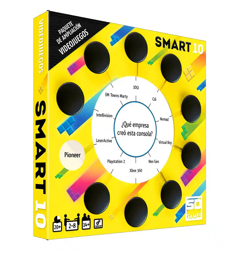 Juego De Mesa Smart 10: Videojuegos Calificación BGG: 7.1 REQUIERES DEL JUEGO BASE SMART 10 PARA PODER JUGAR ESTA EXPANSIÓN Un nuevo conjunto de tarjetas de preguntas para el juego SMART10! Este paquete incluye 50 tarjetas de doble cara, con 100 nuevas preguntas y un total de 1000 respuestas relacionadas con el apasionante mundo de los videojuegos. En Smart10 Videojuegos pondrás a prueba tus conocimientos sobre juegos digitales, desde los clásicos retro hasta las últimas novedades, pasando por compañías desarrolladoras, personajes icónicos y mucho más. Puedes reemplazar las tarjetas originales de preguntas en la caja SMART con dos paquetes de ampliación temáticos o bien mezclar estas preguntas de videojuegos con la mitad del set original. Para jugar, es necesario contar con la caja SMART incluida en el juego base de Smart10. • Tipo de juego: Competitivo • Edad: 14 años en adelante • Número de Jugadores: 2 a 8 jugadores • Tiempo de Juego: 20 minutos • Dificultad (1-5): 1.00 • Idioma: Español CONTENIDO DE LA CAJA • 10 marcadores • 100 tarjetas • 1 reglamento Recuerda, somos TIENDA MOVITEC.