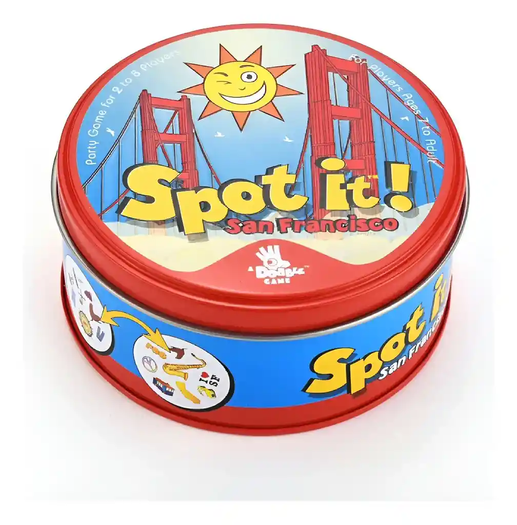 Características principales Marca Dobble Game Editorial Spot it Nombre del juego de mesa Spot it (Dobble) juego de mesa Edición San Francisco Características de venta Formato de venta Unidad Otros Es para adultos Sí Edad mínima recomendada 7 años Cantidad mínima de jugadores - Cantidad máxima de jugadores 2 - 8 Es un juego de cartas Sí Formato Físico