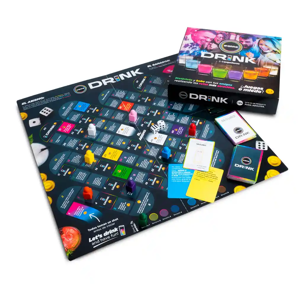 Juego de Mesa Wanna Drink: Una experiencia como nunca antes vista en juegos de mesa. Wanna Drink es un juego de mesa que reúne a amigos para vivir momentos inolvidables acompañados por emocionantes penitencias, miles de risas y shots de licor. El juego se desarrolla en el cumplimiento de cómicos y divertidos retos que pondrán a prueba a todos los participantes. La experiencia Wanna Drink es recomendada de 2 a 8 jugadores, los cuales disfrutarán de un tablero con 83 casillas que traen diferentes acciones para realizar durante la partida. A esto se le añaden, dos tandas de mazos, Cartas "Drink" y Cartas "Seguro" que, dependiendo de la casilla en la que quede el jugador, deberá tomar una y ejecutar una penitencia. Se debe tener en cuenta que a medida en que se avance en el juego, la dificultad de los retos y penitencias se intensificará. ¿Cómo jugar Wanna Drink? En caso de ser entre dos a cuatro jugadores, se debe jugar únicamente con un dado, para más de cinco jugadores, se permitirá jugar con ambos dados. Para iniciar la partida, todos los jugadores deben tomar un shot de licor, por ende, se deberá tener en cuenta que los jugadores son los encargados de llevar el licor para ejecutar la partida. Luego cada jugador selecciona su ficha y al tirar los dados podrá avanzar en el juego mientras cumpla con las acciones que se indican en cada casilla. Se debe tener en cuenta acomodar cada mazo en el lugar indicado. Las reglas del juego podrán ser revisadas durante toda la partida en caso de dudas en el interior de la caja de Wanna Drink. Un factor importante es que el perdedor será quien no pueda consumir más licor, se rehúse a hacer una de las penitencias o cambie a su favor el juego. Para su castigo el ganador del juego, le entregará una carta a su elección con la acción que debe ejecutar al final de la partida. Contenido El juego incluye: • Dos dados marcados del uno al seis • Un tablero • 50 cartas: Incluye dos mazos de cartas: cartas drink (25 unidades) y cartas seguro (25 unidades) • 8 fichas en diferentes colores • Una guía de juego con el paso a paso Presentación: Juego de mesa para divertirse con amigos y beber mientras realizan retos Confidencialidad: Tus pedidos se envían en una caja o sobre totalmente sellado opaco sin ningún tipo de marcas externas. Para nosotros es muy importante tu privacidad.