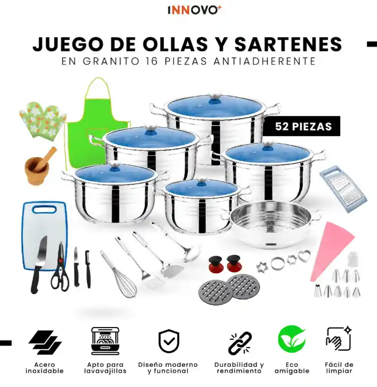 JUEGO DE OLLAS Y ACCESORIOS DE FABRICA Renueva tu cocina con el Juego de Ollas 52 piezas Innovo+ en acero inoxidable, diseñado para quienes buscan calidad, durabilidad y practicidad. Con diferentes tamaños de ollas con tapa de vidrio templado y múltiples utensilios incluidos, tendrás todo lo que necesitas para cocinar como un chef en casa. Este juego es resistente y elegante, también es apto para lavavajillas, fácil de limpiar y pensado para múltiples necesidades de cocción. Con Innovo+, tu cocina estará equipada con ollas de gran capacidad, utensilios de corte, moldes de repostería y accesorios prácticos para cada receta. Ficha Técnica: Marca: Innovo+ Material: Acero inoxidable Tapas: Vidrio templado con válvula y mango ergonómico Piezas incluidas (52 en total): 5 ollas (30, 32, 34, 36 y 38 cm) con tapa 1 rejilla de 34 cm 3 espátulas + 1 globo batidor 2 cuchillos + 1 tabla de picar Tijeras + pelador 1 mortero 1 manga pastelera + 7 boquillas 1 delantal 2 guantes para horno 1 rallador de acero inoxidable 12 moldes de corte 2 perillas de succión 2 rejillas adicionales Beneficios: Cocina completa en un solo set: incluye ollas, cuchillos, espátulas, moldes y más. Mayor durabilidad: fabricado en acero inoxidable de alta resistencia. Versátil: cubre todas tus necesidades, desde sopas y guisos hasta repostería. Fácil de limpiar: apto para lavavajillas y superficies antiadherentes. Diseño moderno y elegante: ideal para cualquier tipo de cocina. Ideal para familias y chefs caseros que buscan practicidad y variedad.