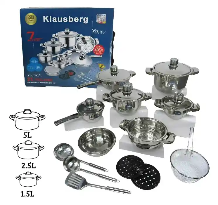 ¡Somos expertos en los mejores artículos de tecnología, belleza y hogar con amplia trayectoria y calidad garantizada! Entregas inmediatas en la ciudad de Bogotá y envíos a Nivel Nacional. Bateria De Ollas Klausberg De 21 Piezas Acero Quirúrgico La batería de ollas cuenta con termo difusión que distribuye de manera uniforme el calor para calentar y cocinar más rápido que las ollas convencionales, además de ser más saludable debido a que todas las piezas son 100% acero quirúrgico. CARACTERÍSTICAS: - Batería en acero quirúrgico. - Tapas con escapes de vapor - Termo difusor en la base. - Apta para cocinar con cualquier estufa (gas, Inducción, halógena) - Las asas son plásticas altamente resistentes al calor. - Las ollas están contramarcadas en la base. Contenido de la caja: 1-Sartén 24 x 6.5 cm con tapa metálica 1-Cazuela de 24 x 14 cm con tapa metálica 1-Cazuela de 20 x 10 con tapa metálica 1-Cazuela de 16 x 8 cm con tapa metálica 1-Cacerola 16 x 8 cm con tapa metálica 1-Bowl de 20 cm con tapa plástica 1-Rejilla freidora con asa metálica 1-Rallador con anillo adaptador 2-Porta-calientes de baquelita 1-Vaporera 20 x 9 cm 1-Perilla de succión 1-Espátula metálica 3-Utensilios Metalicos IMPORTANTE Para poder tener una buena experiencia en tu compra, te recomendamos que leas detalladamente las siguientes recomendaciones: • Lee completamente la descripción del producto. • Revisa muy bien los términos y condiciones de garantía. • Revisa muy bien que sea el producto que necesitas para evitar devoluciones.