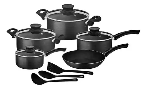 America Store te trae Juego De Ollas Tramontina Aluminio Antiadherente 12 Piezas Perol: 16 cm. Perol: 20 cm. Olla 1: 22 cm. Olla 2: 24 cm. Sartén: 24 cm. Capacidad en litros Perol: 1.5 lt. Perol: 2.9 lt. Olla 1: 3.8 lt. Olla 2: 4.9 lt. Sartén: 1.2 lt.