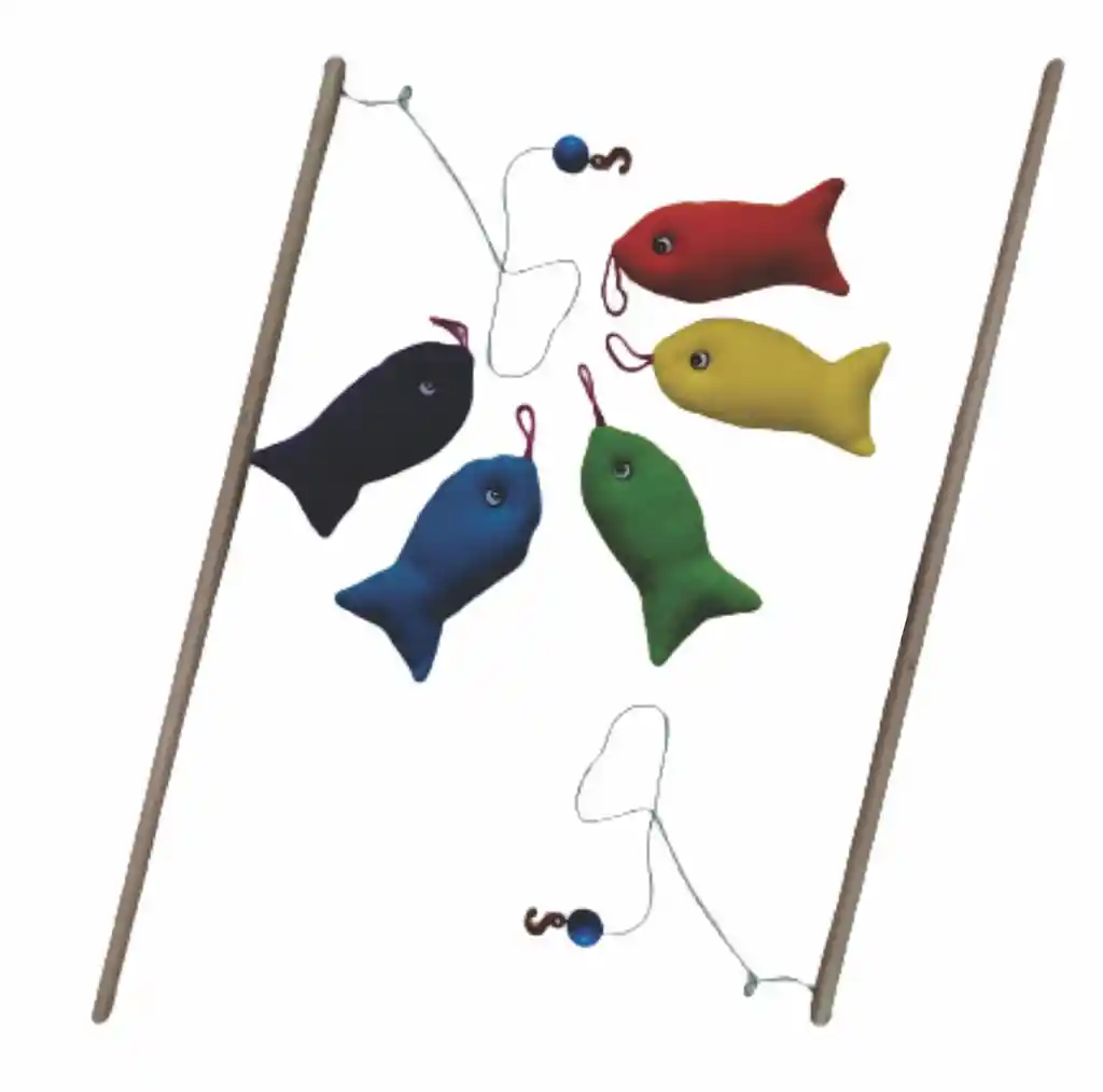 Ref. 1076 Nombre: Juego De Pesca General: Material Didáctico / Pedagógico Uso: Juego Sensorial Edad: +3 Años "Medidas peces (L x P x A cm) :15X7 : 15 X 7 X 3 Medidas Caña: (L X A Cm) : 70 X 1,5" Contenido: 5 Peces 2 Cañas Material: Mdf Y Tela Color: Multicolor