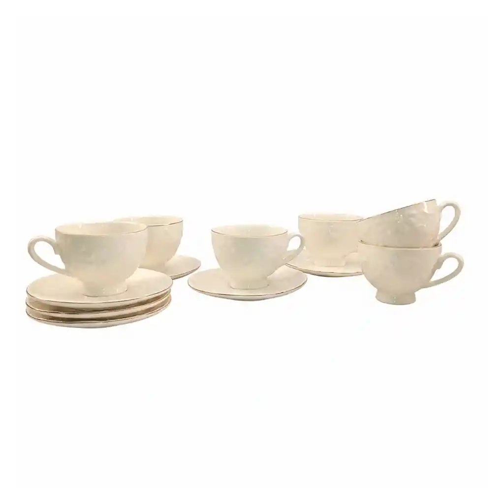 Set completo para 6 puestos incluye 12 piezas: . 6 platos de 10,5cm . 6 Pocillos de 90ml (3oz) . Elaborado en cerámica resistente. Relieve decorativo de flores margarita. Ideal para café espresso o tinto. Acabado brillante y sofisticado. Perfecto para hogar y oficinas. Aporta estilo a tu mesa. Fácil de limpiar y mantener. Excelente opción para regalos. Material durable y de calidad. Diseño moderno y decorativo. La imagen ha sido ambientada; no incluye accesorios adicionales y el color puede variar según la iluminación.