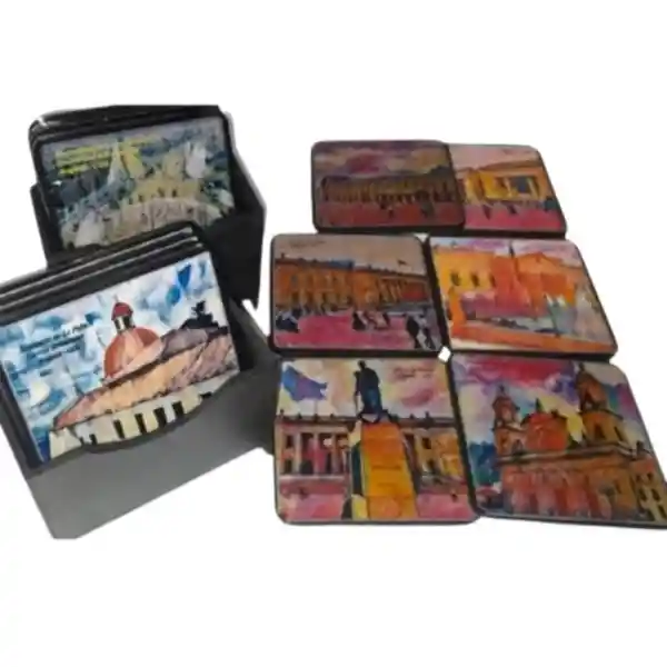Producto elaborado en mdf, con ilustración de sitios turísticos de Bogota, resinado y con tapete debajo para evitar que l a mesa se ralle, incluye una base. son 6 portavasos.