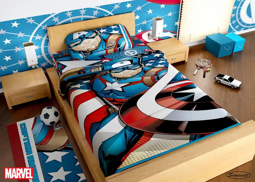 Sencillo 3pc: 1 sobre sabana 152x230cm, 1 sabana auto ajustable 100x190+20cm, 1 fundas 50x70+15cm No hay nada mejor que dormir con tus superhéroes o personajes favoritos de televisión. Con nuestras sabanas de Disney tus hijos dormirán con su personaje preferido y un producto hecho para darle el mejor confort y calidad durante su momento de descanso. Marca Disney Modelo CAPITAN AMERICA Tipo Juegos de sábanas infantiles Estilo Estampado Material principal Microfibra Composición Poliéster Número de hilos No aplica Incluye funda de almohada Sí Dimensiones de la funda de almohada 50 x 70 cm Cantidad de fundas de almohada 1 Hecho en Chile