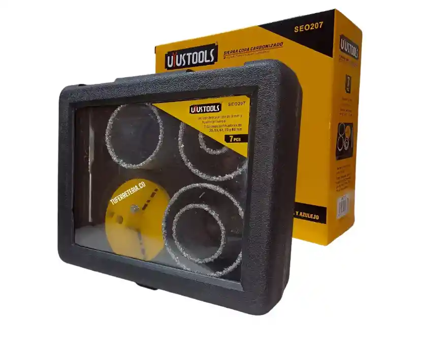 SIERRA COPA CARBONIZADO SET 7 PC CARACTERISTICAS • Acero al carbono endurecido • Bordes continuos de Tungsteno YG8 de 3 mm • Dureza 85 HRC • Incluye husillo universal • Ideal para cortes rápidos en loseta y azulejo :: Maletín Plástico :: 5 coronas perforadoras :: Medidas: 33 - 53 - 67 - 77 y 83 mm :: 1 Husillo universal :: 1 Broca piloto de 9 mm • Ref. SEO207 • MARCA UYUSTOOLS
