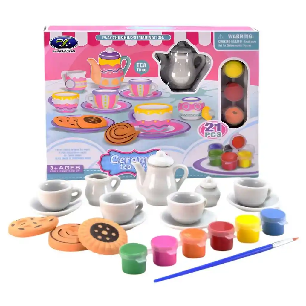 ¡Desata un mundo de creatividad y celebra las fiestas de té más originales con nuestro increíble kit para Pintar tu Propio Juego de Té de Cerámica! Este fantástico set es la combinación perfecta de arte y juego, permitiendo que tu pequeño artista diseñe y personalice una vajilla única en su estilo. El kit viene completo con todo lo necesario para empezar la diversión: un juego de té de cerámica blanca que incluye tetera, tazas, platillos, azucarero, cremera y hasta galletas de cerámica, junto a una paleta de pinturas de vivos colores y un pincel. Primero, disfrutarán de la concentración y la alegría de decorar cada pieza, y una vez secas, tendrán un tesoro personalizado listo para protagonizar innumerables horas de juego imaginativo. Es el regalo ideal para fomentar la expresión artística, la motricidad fina y crear un juguete verdaderamente propio y especial. Ficha Técnica: Dimensiones del empaque : 25 cm x 19 cm x 4 cm Material: Porcelana Edad Recomendada: +3 Años Certificado de conformidad: E5-0359-2021 Referencia: 868-D29 Para defectos de fábrica o retractos: Por favor revise el producto apenas lo reciba y antes de usarlo. No aplican ley de retracto o defectos de fábrica luego de usar el producto. Se manejan máximo 5 días para reportar defectos de fábrica (por ejemplo, producto funciona mal, piezas faltantes, rotas, etc). Para hacer efectiva la devolución el producto debe devolverse con el empaque original, el cual debe estar en buen estado, incluir todos los documentos y las partes completas y sin daños.