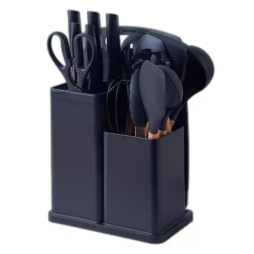Somos TELEPRODUCTOS BOGOTA Productos 100% garantizados, años de experiencia en ventas online.! -Cuando realices la compra recibirás toda la información de contacto y datos para que puedas hacer seguimiento a tu producto.! ----------------------------------------------------------------------------------------------------------------------- Satisface todas tus necesidades de la cocina: juego de utensilios de cocina 19 en 1, juego de utensilios de cocina de silicona y accesorios de cocina para satisfacer tu máxima demanda, sea tu asistente de cocina. Juego de cuchillos 5 en 1: incluye cuchillo de chef de 8 pulgadas, cuchillo de pelar de 3.5 pulgadas, cuchillo de pan de 8 pulgadas, cuchillo de rebanar de 8 pulgadas, cuchillo multiusos de 5 pulgadas, soporte para cuchillos de almacenamiento conveniente de cuchillos de cocina. Juego de utensilios de cocina de silicona de 11 piezas: el juego de utensilios de cocina está hecho de silicona altamente duradera. Incluye cucharón de sopa profunda. Cuchara de servir. Cuchara ranurada. Turner ranurado. Servidor de pasta. Espátula flexible. Brocha para hilvanar. Batir. Pinzas. Espátula redonda. Turner. CALIDAD: Cuchillas superiores de acero inoxidable de alto carbono para una precisión que garantizan que las cuchillas conserven su borde ultra afilado y precisión precisa para cortar alimentos. Materiales de calidad y resistentes al calor: el juego de utensilios de cocina está hecho de silicona altamente duradera. Los utensilios de cocina pueden soportar temperaturas de hasta 480 °F. Mango de silicona anti quemaduras que protege tu mano de quemaduras. Utensilios de cocina antiadherentes de seguridad. Garantía del vendedor: 30 días