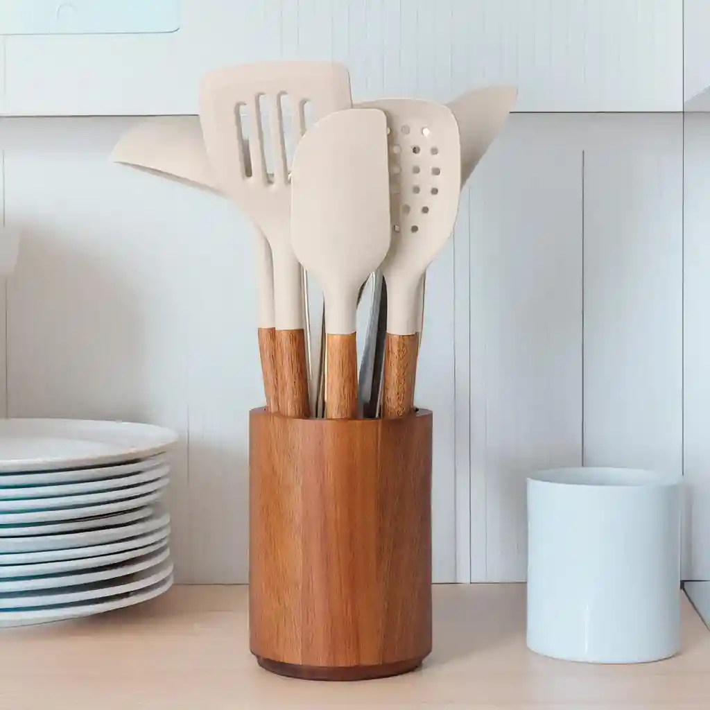 Este juego de 8 piezas está diseñado para facilitar la preparación de alimentos, ofreciendo herramientas versátiles y resistentes que se adaptan a cualquier tipo de cocina, incluyendo sartenes y ollas con recubrimiento antiadherente. Cuentan con cabezales de silicona resistentes al calor, lo que evita daños en las superficies de cocción y garantiza una manipulación segura de los alimentos. Sus mangos ergonómicos ofrecen un agarre cómodo y seguro, reduciendo la fatiga durante el uso prolongado. El juego incluye una selección de utensilios esenciales, como una espátula ranurada, una espátula sólida, una espumadera, un cucharón, una espátula de silicona, un batidor de globo y unas pinzas de cocina cubriendo todas las necesidades básicas de cocina. Además, su diseño moderno los convierte en un complemento decorativo ideal para cualquier cocina. Fáciles de limpiar y aptos para lavavajillas, te ofrecen una solución práctica y duradera para la preparación de comidas diarias. Información del producto: Juego de 8 utensilios de cocina con silicona apta para alimentos. Es fácil de limpiar, duradera y resistente a altas temperaturas. Mangos de madera, cada uno tiene un patrón de grano de madera único. Con soporte de madera de acacia, conveniente para almacenarlos. Libres de BPA. Hecho en China.