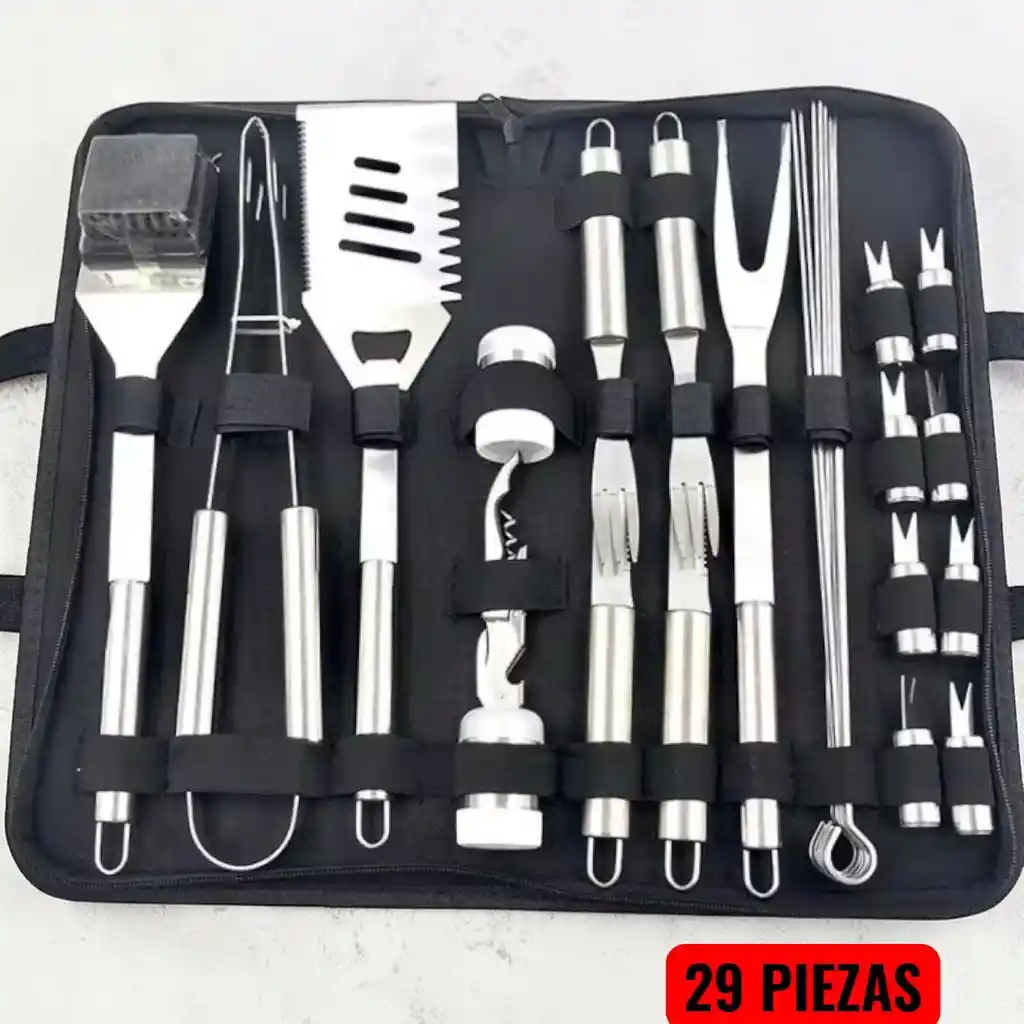 Este completo juego de parrilla BBQ de 29 piezas está diseñado para quienes disfrutan asar con comodidad, precisión y estilo. Incluye una amplia variedad de utensilios esenciales que facilitan la preparación, manipulación y servicio de carnes, vegetales y otros alimentos a la parrilla. Fabricado en acero inoxidable, ofrece alta resistencia al calor, durabilidad y fácil limpieza, ideal para uso frecuente en asados familiares, reuniones o eventos al aire libre. Cada pieza cuenta con mangos firmes y ergonómicos, brindando un manejo seguro durante la cocción. El set se presenta en un estuche organizador con cierre, que permite mantener todos los utensilios ordenados, protegidos y listos para transportar. Su diseño compacto lo hace práctico tanto para el hogar como para llevar a paseos, fincas o actividades de camping. Es una excelente opción para aficionados y amantes de la parrilla que buscan un kit completo, funcional y confiable, también ideal como regalo. Ideal para Asados en casa, reuniones familiares, camping, paseos y uso frecuente en parrilla. Incluye Set completo de 29 utensilios para parrilla con estuche de transporte