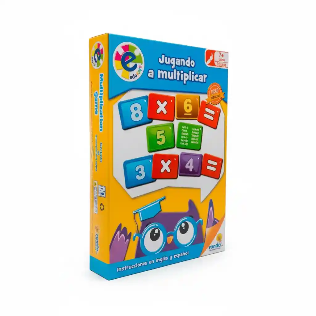 Juego Didáctico Educativo para Niños - Jugando a Multiplicar Incluye: - 48 tarjetas doble faz a color (tarjetas con números, signos, resultados y tablas) - Instrucciones en inglés y español Marca: Ronda Edad recomendada: 7+ Características: - Refuerza el aprendizaje de las tablas de multiplicar del 1 al 9. - Tarjetas grandes, coloridas y resistentes, ideales para uso frecuente. - Estimula el razonamiento lógico, la memoria y la concentración. - Perfecto para niños en etapa escolar que necesitan reforzar matemáticas básicas. - Ideal para aula, tareas en casa o apoyo pedagógico. Beneficios educativos: - Potencia la habilidad numérica y el cálculo mental. - Favorece la coordinación visual y la asociación de conceptos. - Aumenta la seguridad y confianza del niño al aprender. - Permite actividades individuales o juegos grupales.