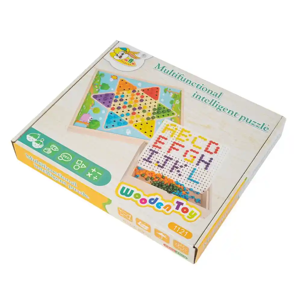 Empaque de regalo sin costo adicional, escríbenos al finalizar la compra. 3 años + Este juego de madera educativo multifuncional es una opción ideal para estimular la creatividad, la memoria y la habilidad de los niños mientras juegan de forma activa. Su diseño reúne varias actividades en un solo producto, permitiendo formar letras, números, figuras y dibujos con botones de colores, además de trabajar clasificación, asociación visual y reconocimiento de formas. Es perfecto para mantener a los pequeños entretenidos mientras desarrollan capacidades clave de aprendizaje de una manera práctica y divertida. Gracias a sus múltiples formas de uso, este juguete acompaña distintas etapas del desarrollo infantil, fortaleciendo la motricidad fina, la coordinación mano-ojo y la concentración. Incluye retos de memoria, clasificación por colores, actividades con cuerdas y piezas de madera, e incluso opciones de juego más libres para dejar volar la imaginación. Es un producto llamativo, completo y educativo, ideal para padres que buscan un juguete duradero que entretenga de verdad y no termine olvidado en una esquina al segundo día. Tamaño: 28x 24x 4cm