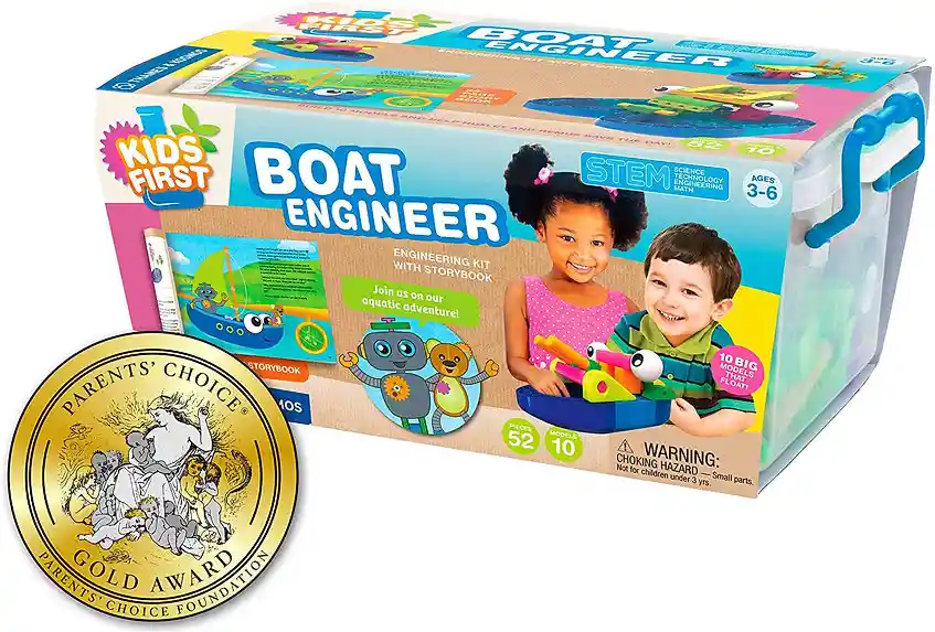 Empaque de regalo sin costo adicional, escríbenos al finalizar la compra. 3 años + Lee la divertida historia en inglés de dos jóvenes ingenieros curiosos, Ty y Karlie, y los robots de su familia, Huxley y Remus. Construye modelos simples de los barcos que encuentran en la historia; piezas de construcción de plástico grandes y coloridas hacen que este kit sea ideal para manos pequeñas. Los barcos realmente flotan en el agua, haciendo experimentos divertidos y fáciles alrededor del fregadero o la bañera. La historia se centra alrededor de Huxley y Remus. Su aventura en la construcción de barcos comienza cuando un pez robótico que están probando va de pajar y nada incontrolablemente. Huxley y Remus construyen un bote de remos en su esfuerzo por ponerse al día y capturar los peces robóticos. Encontran que el bote de remos es demasiado lento, así que construyen un barco para ir más rápido. A medida que la historia continúa, los robots hacen su camino aguas abajo y eventualmente hacia el océano. A lo largo del camino, deben construir nuevos barcos para resolver problemas específicos y realizar tareas. Construyen un velero, un barco de río, lancha rápida, lancha de bomberos, remolcador, carguero, catamarán y un hidroplano.