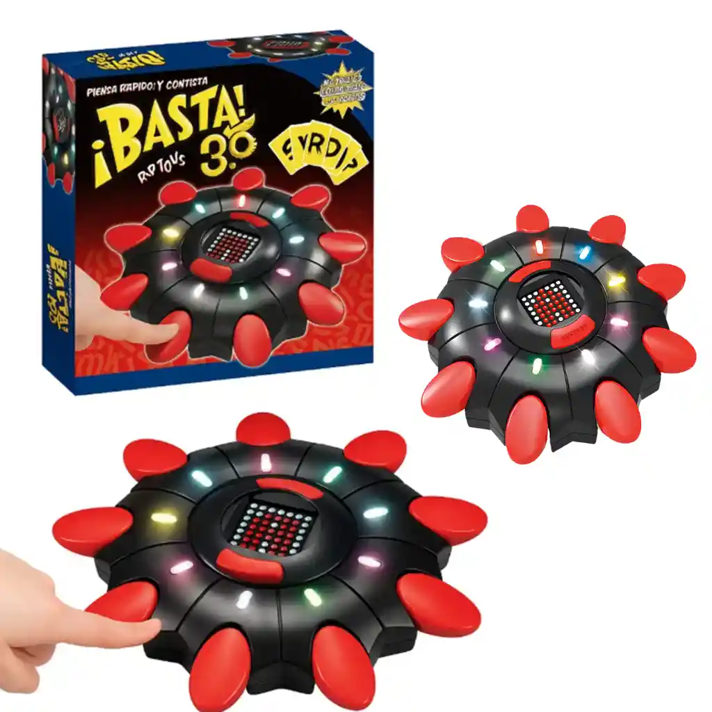 El Juego Electrónico ¡BASTA! 3.0 es la evolución moderna del clásico juego de agilidad mental. Diseñado para desafiar tu rapidez, creatividad y pensamiento inmediato, este dispositivo incorpora luces LED, sonidos dinámicos y múltiples botones, ofreciendo una experiencia competitiva y divertida para jugadores de todas las edades. Con solo presionar un botón, el dispositivo selecciona automáticamente letras y categorías, encendiendo luces y marcando turnos con precisión. Su diseño circular con 10 botones grandes y cómodos permite que varios jugadores participen al mismo tiempo, convirtiéndolo en el protagonista ideal para reuniones familiares, fiestas o actividades de integración. El centro del dispositivo incluye una pantalla digital de puntos estilo matriz LED, que muestra animaciones y señales durante el juego. Su estructura robusta y materiales de alta calidad garantizan durabilidad, mientras que los colores vivos y luces brillantes crean una experiencia visual atractiva. Características principales • Juego electrónico de rapidez mental tipo ¡Basta!/Stop • Luces LED multicolor y sonidos interactivos • Botones amplios y sensibles al tacto • Pantalla de matriz LED en el centro • Ideal para varios jugadores • Material plástico ABS de alta resistencia • Activación automática de rondas • Ideal para niños, jóvenes y adultos Medidas aproximadas del producto • Diámetro del dispositivo: 20–22 cm • Altura: 4–5 cm • Botones individuales: 3–4 cm de largo • Caja: 23 × 23 × 9 cm Incluye • 1 juego electrónico ¡Basta! 3.0 • Manual de instrucciones • Requiere baterías (normalmente AA – según versión) Ideal para • Fiestas y reuniones • Actividades familiares • Competencias entre amigos • Desarrollar agilidad mental y memoria