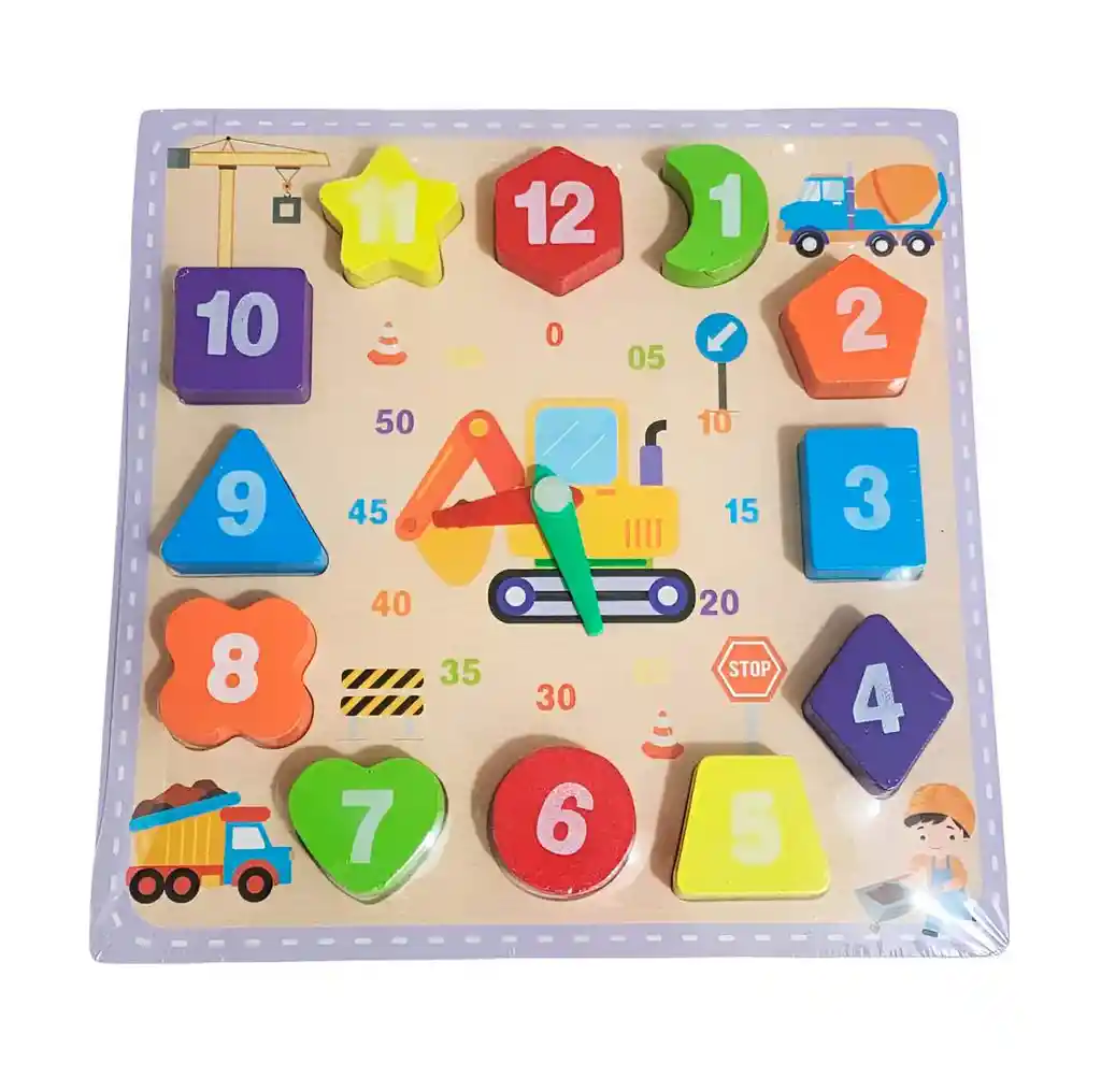 Reloj didáctico de madera con piezas de diferentes formas y colores que representan los números del 1 al 12, diseñado para que los niños aprendan a reconocer las horas de manera divertida; incluye manecillas móviles y un tablero central con marcas de minutos, ideal para estimular la noción del tiempo, la concentración, la coordinación y el aprendizaje temprano a través del juego. Ficha Técnica: Material: Plástico ABS Dimensiones : 18 cm x 18 cm x 2 cm Apto para niños + 3 Años Referencia: CNS-057 Certificado de conformidad: CS-LCO-13233 ** _Para defectos de fábrica o retractos: \_Por favor revise el producto apenas lo reciba y antes de usarlo. No aplican ley de retracto o defectos de fábrica luego de usar el producto. Se manejan máximo 5 días para reportar defectos de fábrica (por ejemplo, producto funciona mal, piezas faltantes, rotas, etc). Para hacer efectiva la devolución el producto debe devolverse con el empaque original, el cual debe estar en buen estado, incluir todos los documentos y las partes completas y sin daños.