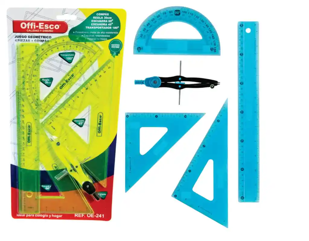 Incluye: compás, regla de 30 cm, escuadra de 60°/30°, escuadra de 45°/45° y transportador de 180°