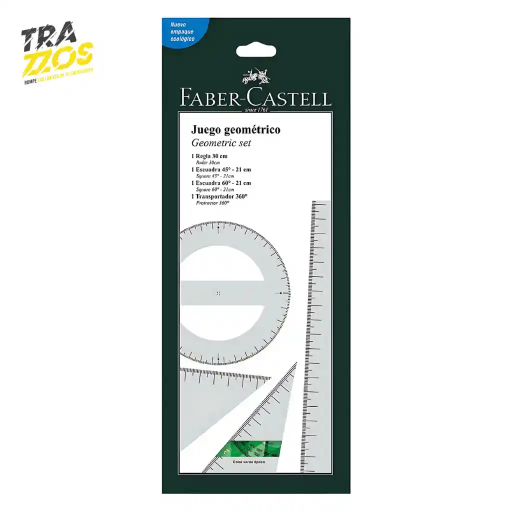 "Juego geométrico perfecto para trabajar en clases de dibujo, geometría, diseño, arquitectura e ingeniería. Fáciles de transportar y resistentes. Juego con 2 escuadras de 45º y 60º de 21 cm 1 regla de 30 cm 1 transportador de 360º"