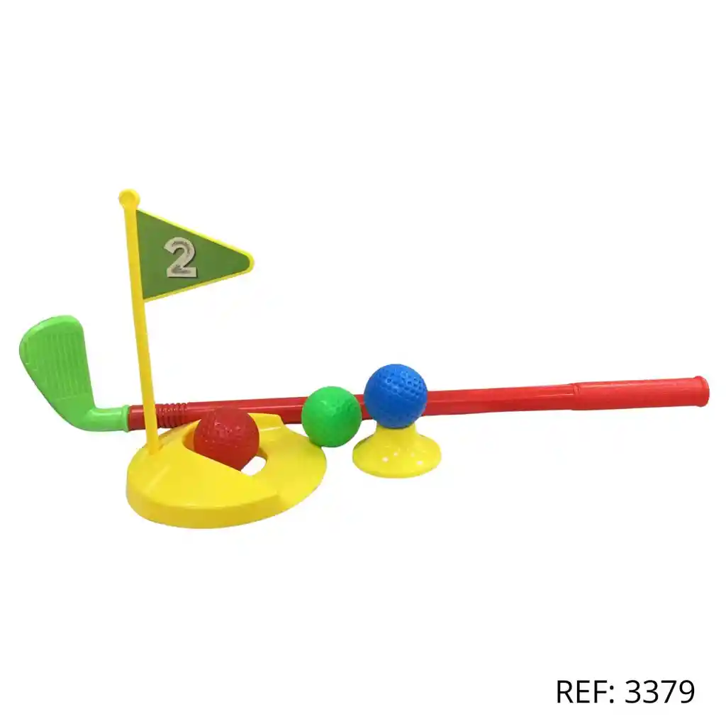 Set de golf infantil con bandera, palos y pelotas. Ideal para jugar al aire libre y en casa.