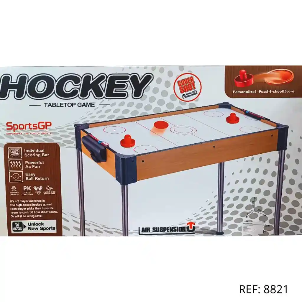 Mesa de Air Hockey de patas altas, diseño firme y superficie rápida. Ideal para juegos dinámicos.