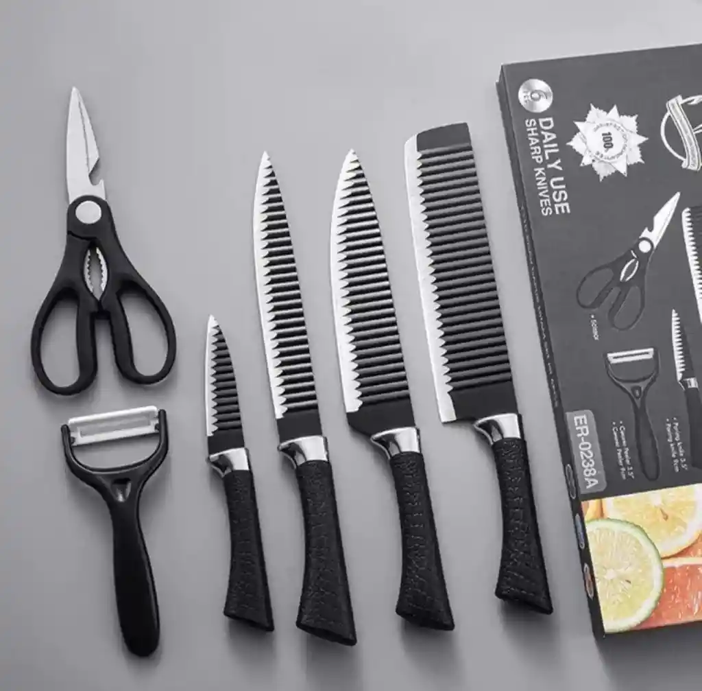 CARACTERÍSTICAS Este set profesional para cocina incluye 4 cuchillos, 1 tijera y 1 pelador de cerámica. Los mangos ergonómicos antideslizantes son cómodos de agarrar. El material de primera calidad es a prueba de óxido, fácil de usar y limpiar. Su alta dureza y robustez hacen que se desempeñen bien en rebanar, cortar en cubitos, picar y más. El set incluye cuchillo de chef, cuchillo de trinchar, cuchillo pequeño, cuchillo de cocina, tijeras y pelador de cerámica. CONTENIDO 1 * cuchillo de chef 8" (33CM) 1 * cuchillo de trinchar 8 (33CM) 1 * cuchillo pequeño 3,5" (20CM) 1 * cuchillo de cocina 8" (33CM) 1 * tijeras de cocina 1 * pelador 6" (14.5CM)