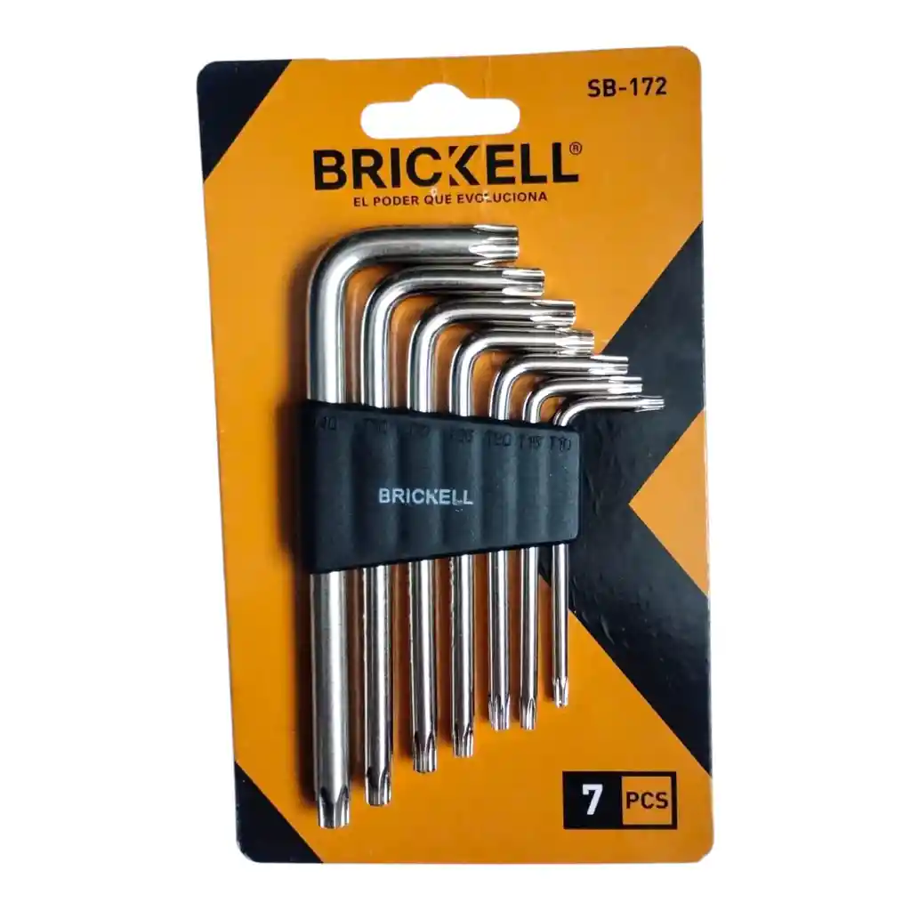 *Set de llaves TORK modelo estrella marca BRICKELL de 7 piezas fabricadas en acero cromo-vanadio ultra resistente y sus medidas van desde T10 hasta T40. *Tratado termicamente. *Acabado satinado. *Soporte de plastico. *Producto de alta calidad en blíster. MEDIDAS *T-10 1.5mm *T-15 2.0mm *T-20 2.5mm *T-25 3.0mm *T-27 4.0mm *T-30 5.0mm *T40 6.0mm
