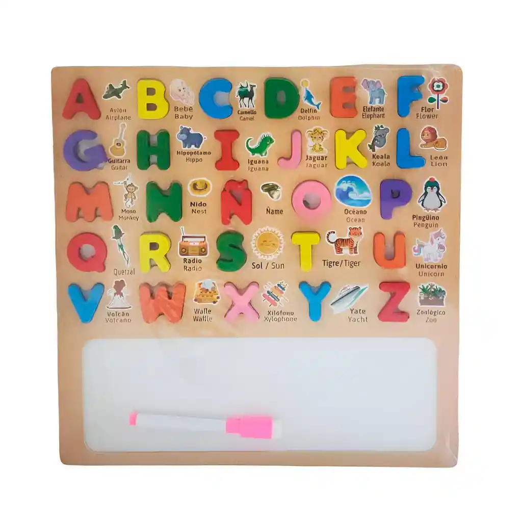 Rompecabezas de madera con letras del abecedario en relieve, acompañado de ilustraciones y nombres en español e inglés, ideal para que los niños aprendan de forma divertida a reconocer las letras y ampliar su vocabulario; incluye además un marcador con borrador y espacio para escribir en la parte inferior, fomentando la creatividad, el lenguaje y la motricidad fina. Ficha Técnica: Material: Plástico ABS Dimensiones : 30 cm x 30 cm x 1 cm Apto para niños + 3 Años Referencia: CNS-039 Certificado de conformidad: CS-LCO-13233 ** _Para defectos de fábrica o retractos: \_Por favor revise el producto apenas lo reciba y antes de usarlo. No aplican ley de retracto o defectos de fábrica luego de usar el producto. Se manejan máximo 5 días para reportar defectos de fábrica (por ejemplo, producto funciona mal, piezas faltantes, rotas, etc). Para hacer efectiva la devolución el producto debe devolverse con el empaque original, el cual debe estar en buen estado, incluir todos los documentos y las partes completas y sin daños.