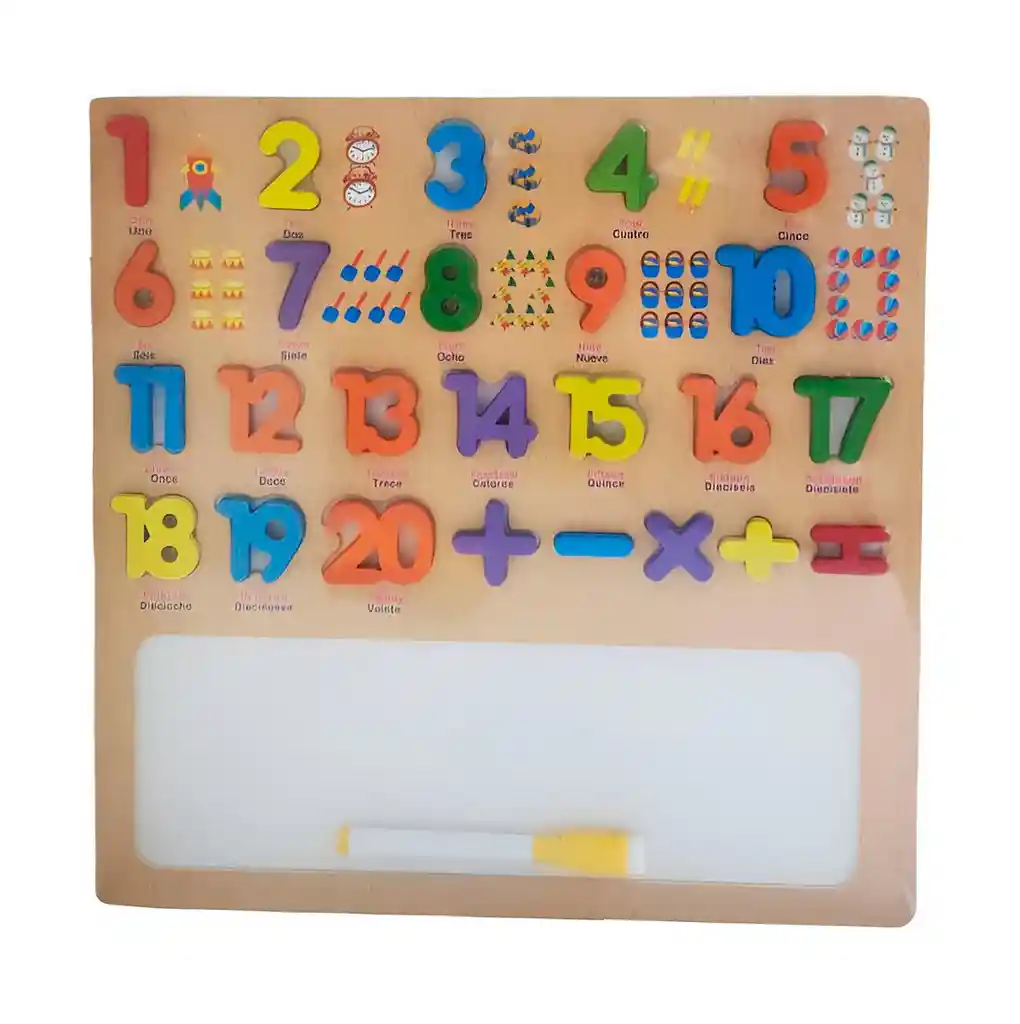 Rompecabezas de madera con números del 1 al 20 en relieve, acompañado de ilustraciones para facilitar el conteo y el aprendizaje, además de símbolos matemáticos para practicar operaciones básicas; incluye un marcador con borrador y espacio para escribir en la parte inferior, convirtiéndose en una herramienta educativa ideal para estimular la concentración, la motricidad fina y el desarrollo temprano de habilidades matemáticas de forma divertida y práctica. Ficha Técnica: Material: Plástico ABS Dimensiones : 30 cm x 30 cm x 1 cm Apto para niños + 3 Años Referencia: CNS-039 Certificado de conformidad: CS-LCO-13233 ** _Para defectos de fábrica o retractos: \_Por favor revise el producto apenas lo reciba y antes de usarlo. No aplican ley de retracto o defectos de fábrica luego de usar el producto. Se manejan máximo 5 días para reportar defectos de fábrica (por ejemplo, producto funciona mal, piezas faltantes, rotas, etc). Para hacer efectiva la devolución el producto debe devolverse con el empaque original, el cual debe estar en buen estado, incluir todos los documentos y las partes completas y sin daños.