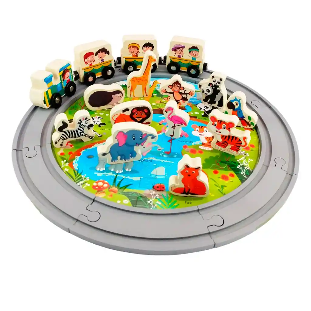 Este encantador juego Montessori incluye una pista de tren circular y un tren de madera que rodea un vibrante rompecabezas en el centro, decorado con una escena de animales en su hábitat natural. Los bloques de animales están cuidadosamente diseñados para que los niños a partir de 3 años disfruten jugando y aprendiendo sobre diferentes especies mientras desarrollan habilidades motoras y de coordinación. Una combinación perfecta de diversión y educación que estimula la imaginación y el amor por la naturaleza. Ficha Técnica: Dimensiones del empaque : 30 cm x 22 cm x 6 cm Material: Madera - ABS Edad recomendada: + 3 años Certificado de conformidad: E5-0359-2021 Referencia: C4075 ** _Para defectos de fábrica o retractos: \_Por favor revise el producto apenas lo reciba y antes de usarlo. No aplican ley de retracto o defectos de fábrica luego de usar el producto. Se manejan máximo 5 días para reportar defectos de fábrica (por ejemplo, producto funciona mal, piezas faltantes, rotas, etc). Para hacer efectiva la devolución el producto debe devolverse con el empaque original, el cual debe estar en buen estado, incluir todos los documentos y las partes completas y sin daños.