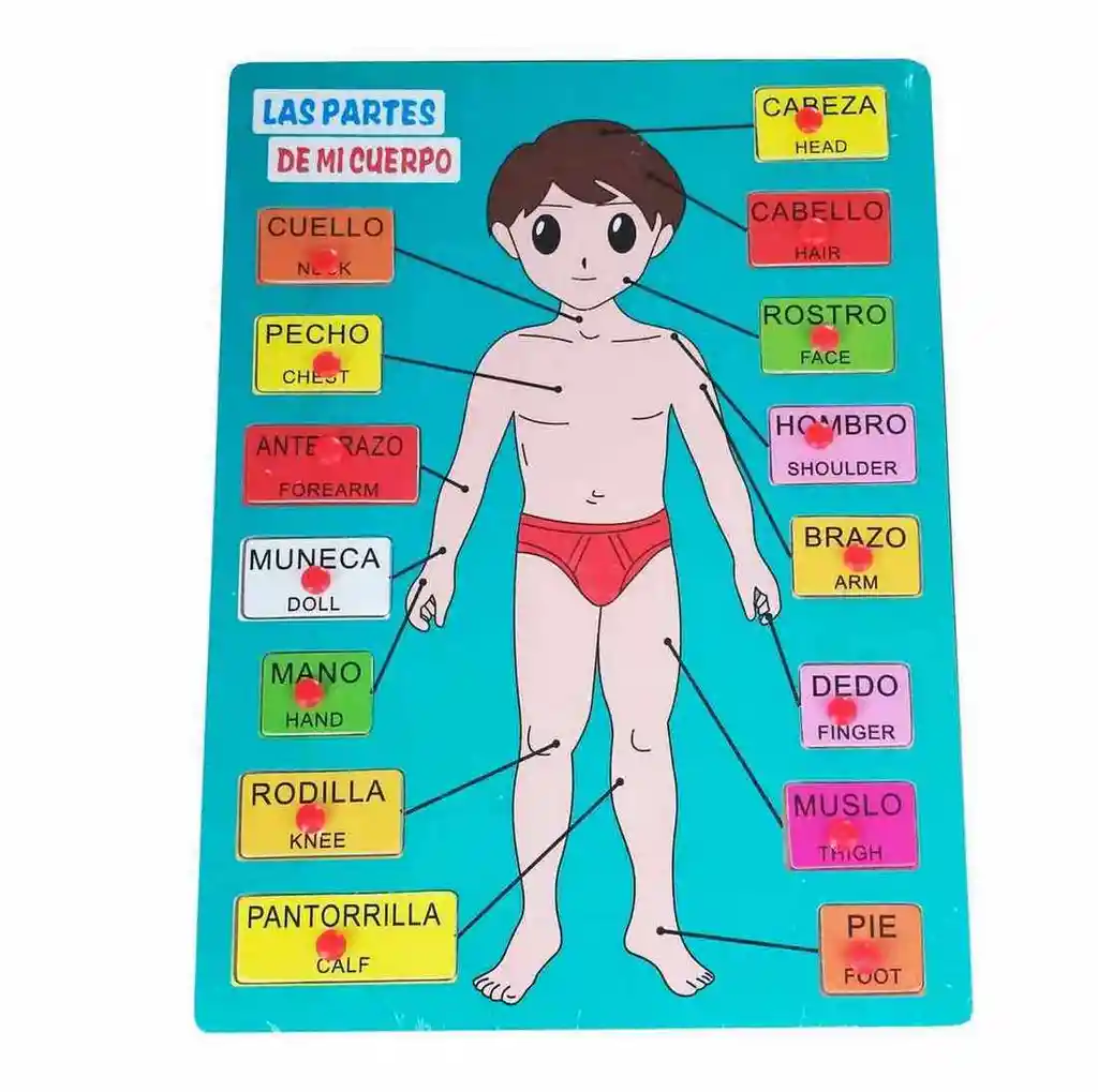Este juego de encastre es perfecto para que los niños aprendan sobre las partes del cuerpo de manera divertida y educativa. Presenta un personaje al que se le señalan cada una de sus partes, tanto en español como en inglés, lo que facilita el aprendizaje bilingüe mientras se juega. Los pequeños deben encastrar correctamente cada parte en su lugar correspondiente, lo que les ayuda a desarrollar su motricidad fina, coordinación y habilidades lingüísticas. Con su diseño interactivo y educativo, este juego es ideal para que los niños se familiaricen con el vocabulario de las partes del cuerpo mientras disfrutan del desafío de armarlo. ¡Una experiencia de juego y aprendizaje en un solo producto! Ficha Técnica: Dimensiones: 30 cm x 22 cm x 0.5 cm Material: Madera Edad recomendada + 3 Años Certificado de conformidad: SL-CS-210044 Referencia: DM1233 ** _Para defectos de fábrica o retractos: \_Por favor revise el producto apenas lo reciba y antes de usarlo. No aplican ley de retracto o defectos de fábrica luego de usar el producto. Se manejan máximo 5 días para reportar defectos de fábrica (por ejemplo, producto funciona mal, piezas faltantes, rotas, etc). Para hacer efectiva la devolución el producto debe devolverse con el empaque original, el cual debe estar en buen estado, incluir todos los documentos y las partes completas y sin daños.