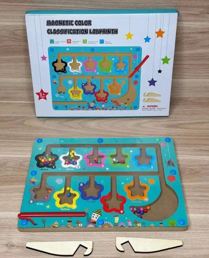 Clasificación de colores: Los niños aprenden a identificar y agrupar objetos por color. Habilidades motoras finas: El uso del lápiz magnético para mover las bolas mejora la destreza manual y la coordinación ojo-mano. Juego interactivo: Fomenta la interacción y el aprendizaje a través del juego.