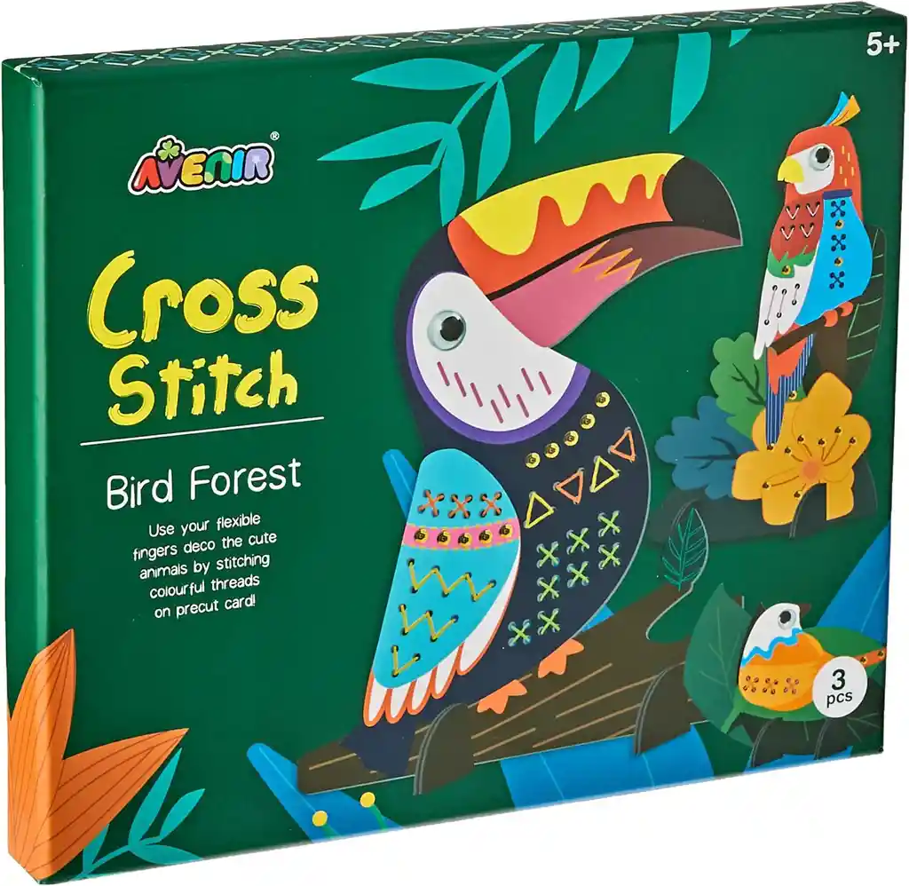 5 años + Este kit de punto de cruz incluye 5 hilos de colores, una aguja de coser de plástico y una hoja de instrucciones. Presenta una serie de proyectos precortados, destacando adorables pájaros coloridos listos para ser bordados en cruz. Es la introducción perfecta al mundo del punto de cruz, ideal para niños a partir de 5 años. Los dulces adornos de punto de cruz en forma de pájaros ofrecen una divertida actividad creativa para los más pequeños. Siguiendo las sencillas instrucciones, los niños pueden crear lindos amigos bordados. Este kit no solo fomenta el desarrollo de la motricidad fina, sino que también proporciona una oportunidad perfecta para la interacción y diversión entre padres e hijos. Los tres pájaros bordados pueden exhibirse utilizando el embalaje del kit. Tamaño: 24 x 20 x 3cm
