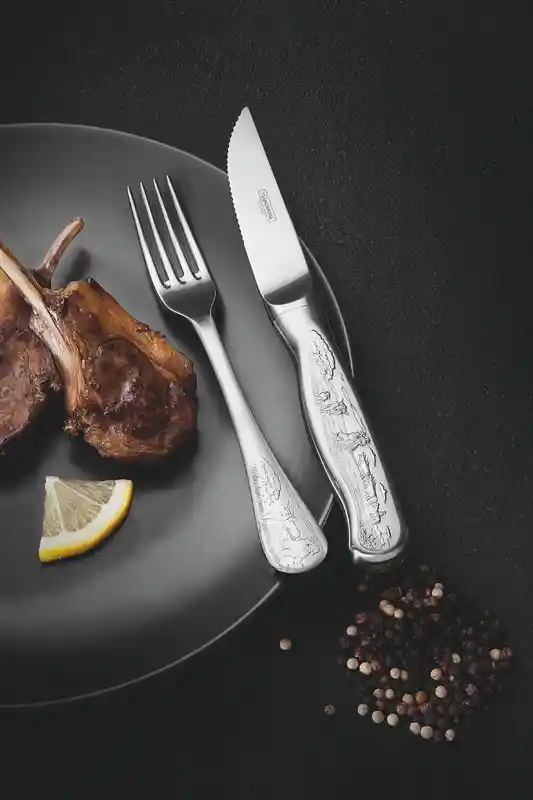 A los que les gusta un buen asado también les gusta un bello cuchillo. El diseño es sofisticado y lleva mucha elegancia a la mesa. <br>De acero inoxidable, altamente durable, mantiene las características originales, preservando la belleza, la higiene y la durabilidad del material. <br>Tenedores con dientes pulidos en la parte interna, con formato apropiado para la boca y bordes redondeados para proporcionar más comodidad en el uso. <br>Cuchillo con lámina templada y filo con dientes, que le garantiza mayor durabilidad al filo de corte y mayor resistencia a la corrosión y, por su característica de templabilidad, no araña la porcelana. <br>Terminación en alto brillo. <br>Posee mango con grabado en alto relieve. <br>Mango que se adapta mejor a la palma de la mano. <br>Equilibrio armónico entre el mango y la lámina. <br>Se pueden lavar diariamente en lavavajillas.