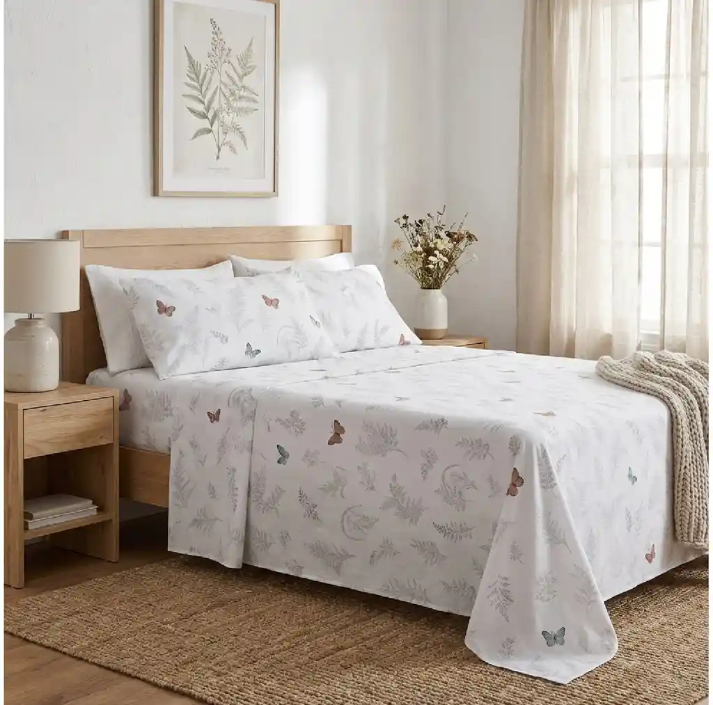 Juego de Sábanas Juego Sábanas Butterfly Dale a tu habitación un toque de naturaleza y serenidad con nuestro Juego Sábanas Butterfly Con un diseño inspirado en la frescura del follaje botánico, este set combina tonalidades azules y verdes que invitan al descanso profundo y la relajación. Calidad de Fabricación Este producto es fabricado por My Home Store, una empresa colombiana con 18 años de experiencia en el mercado de textiles para el hogar. Cada pieza refleja nuestro compromiso con la durabilidad, el estilo y el confort de las familias colombianas. Características Destacadas Textura Confortable: Sábanas suaves al tacto, ideales para un sueño ininterrumpido. Resistencia: Colores que se mantienen vibrantes tras cada lavado gracias a procesos de alta calidad. Set Completo: Incluye sábana plana, sábana ajustable y dos fundas de almohada. Disponibilidad de Medidas Contamos con opciones para cada necesidad, asegurando el ajuste ideal para tu colchón: Tamaño Medidas (cm) Complementos Sencillo 100 x 190 Sábanas + 2 Fundas Semidoble 120 x 190 Sábanas + 2 Fundas Doble 140 x 190 Sábanas + 2 Fundas Queen 160 x 190 Sábanas + 2 Fundas King 200 x 200 Sábanas + 2 Fundas