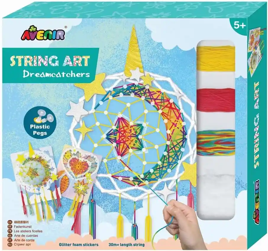 5 años+ ¡Desata tu creatividad y haz una hermosa obra de arte con el kit de manualidades con cuerdas de Avenir! Con este set, podrás envolver y enrollar cuidadosamente la cuerda de colores alrededor de las clavijas, permitiéndote decorar y lograr un acabado fabuloso de manera fácil. Convierte tus ideas en realidad colocando 2 atrapa sueños mágicos y decorándolos con las pegatinas brillantes incluidas en el kit. Las clavijas de plástico se insertan en el tablero sin puntas afiladas, garantizando una experiencia segura y divertida. Cada paquete contiene 2 hojas de arte con cuerdas, clavijas de plástico, cuerdas de colores y hermosas piezas decorativas, todo lo que necesitas para explorar tu lado artístico. El tamaño del paquete es de 19,5 x 4 x 20,5 cm, ideal para llevar la diversión a cualquier lugar. Tamaño: 20 x 19 x 4cm