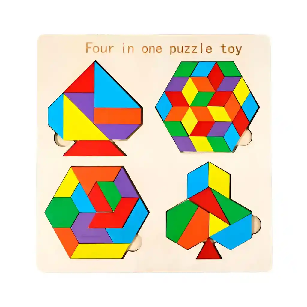 Rompecabezas de encastre en madera con cuatro figuras diferentes y piezas de colores llamativos, diseñado para que los niños desarrollen la concentración, la coordinación ojo-mano y el pensamiento lógico mientras encajan cada forma en su lugar, estimulando la creatividad y el aprendizaje a través de un juego educativo y divertido. Ficha Técnica: Dimensiones: 22 cm x 22 cm x 1 cm Material: Madera Edad recomendada + 3 Años Certificado de conformidad: SL-CS-210044 Referencia: 2407-21 ** _Para defectos de fábrica o retractos: \_Por favor revise el producto apenas lo reciba y antes de usarlo. No aplican ley de retracto o defectos de fábrica luego de usar el producto. Se manejan máximo 5 días para reportar defectos de fábrica (por ejemplo, producto funciona mal, piezas faltantes, rotas, etc). Para hacer efectiva la devolución el producto debe devolverse con el empaque original, el cual debe estar en buen estado, incluir todos los documentos y las partes completas y sin daños.