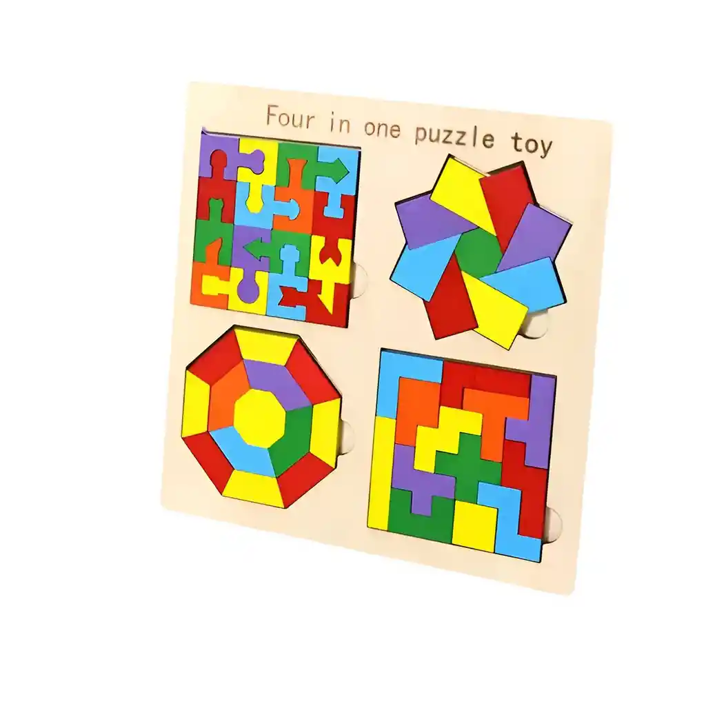 Rompecabezas de encastre en madera con cuatro figuras diferentes y piezas de colores llamativos, diseñado para que los niños desarrollen la concentración, la coordinación ojo-mano y el pensamiento lógico mientras encajan cada forma en su lugar, estimulando la creatividad y el aprendizaje a través de un juego educativo y divertido. Ficha Técnica: Dimensiones: 22 cm x 22 cm x 1 cm Material: Madera Edad recomendada + 3 Años Certificado de conformidad: SL-CS-210044 Referencia: 2407-21 ** _Para defectos de fábrica o retractos: \_Por favor revise el producto apenas lo reciba y antes de usarlo. No aplican ley de retracto o defectos de fábrica luego de usar el producto. Se manejan máximo 5 días para reportar defectos de fábrica (por ejemplo, producto funciona mal, piezas faltantes, rotas, etc). Para hacer efectiva la devolución el producto debe devolverse con el empaque original, el cual debe estar en buen estado, incluir todos los documentos y las partes completas y sin daños.