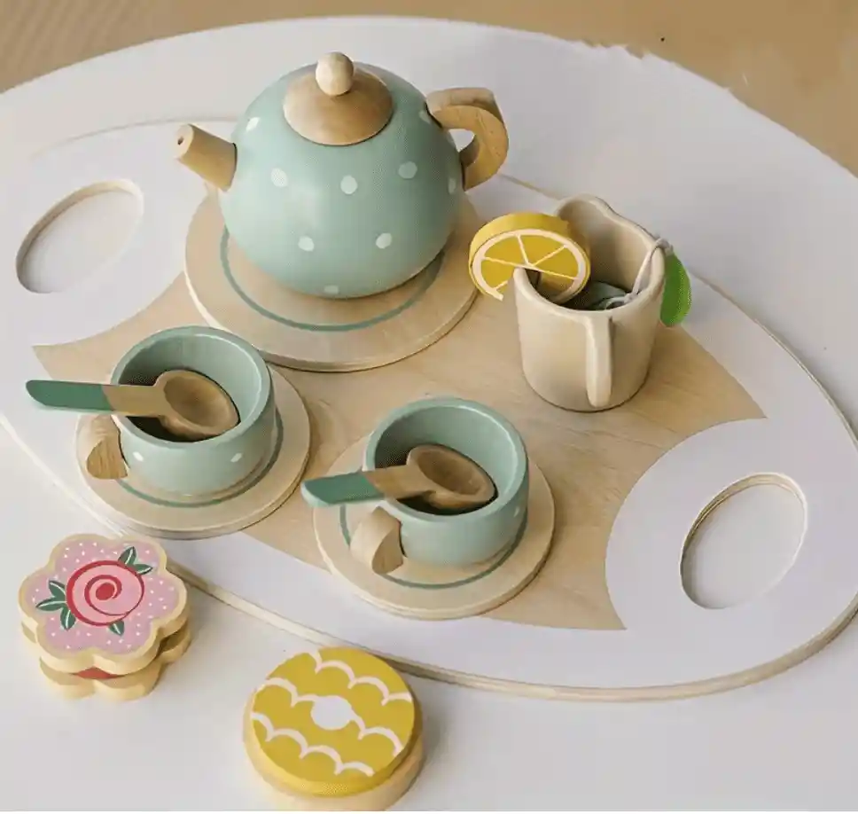 Set de Hora del té en madera, diseñado con colores suaves y formas redondeadas para inspirar momentos de juego simbólico y creatividad. Elaborado en madera de alta calidad con un diseño artesanal lleno de encanto, es el complemento perfecto para fomentar la imaginación y las habilidades sociales de los más pequeños. Medidas aproximadas: Bandeja de servicio: 29 x 17.5 cm (11.41 x 6.88 in). Tetera: 10 x 7.3 cm (3.94 x 2.87 in). Platos: Diámetros de 6.5 cm (2.55 in) y 9 cm (3.54 in). Tazas: 5.5 x 3 cm (2.17 x 1.18 in). Cucharas: 2.5 x 6.8 cm (0.98 x 2.68 in). Jarra de leche: 6 x 4.5 cm (2.36 x 1.77 in). Accesorios (Galletas y Té): Entre 3 cm y 9.5 cm de largo.