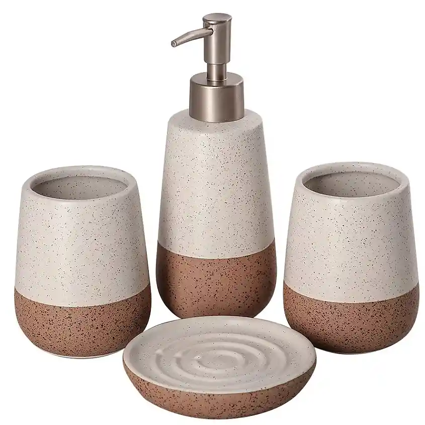 "INCLUYE Set de 4 piezas: 1 Dispensador de jabón líquido 2 Vaso multiusos 1 Jabonera CARACTERÍSTICAS Tipo: Set de accesorios para baño Estilo: Nórdico, Rústico Moderno y Natural Material: Cerámica (Acabado mate con textura visual) MEDIDAS Dimensiones del empaque / Set: 23 x 27 x 8 cm (Aproximado) USOS RECOMENDADOS Ideal para baños que buscan una estética cálida y orgánica (""Earth tones""). Su diseño de cerámica pesada proporciona estabilidad en superficies húmedas. Perfecto para combinar con toallas en tonos neutros, madera o decoraciones vegetales. INSTRUCCIONES DE USO Y CUIDADO Lavar a mano con agua y jabón suave; el acabado mate puede ser sensible a esponjas metálicas o muy abrasivas. Evitar golpes fuertes, ya que la cerámica es un material rompible. Enjuagar ocasionalmente el interior del dispensador y la bomba para evitar atascos de jabón. NOTA: Las imágenes son de referencia. El patrón del moteado puede variar ligeramente entre piezas."