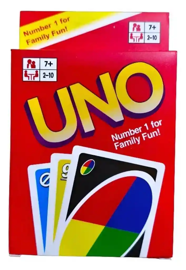 Es un juego de cartas clásico de emparejar números y colores, fácil de aprender y difícil de dejar. Incluye cartas especiales como Saltar, Reversa, Toma dos, Comodín y Comodín Toma Cuatro. Contenido: La baraja de 112 cartas incluye 25 cartas de cada color (rojo, verde, azul y amarillo), ocho cartas de comodín, tres cartas para personalizar y una carta
