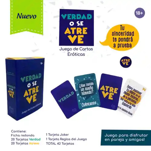 Tu sinceridad te pondrá a prueba. La Verdad o se Atreve es un nuevo juego que puedes disfrutar con tus amigos o pareja. 40 tarjetas entre verdades y atrever, en este juego debes ser sincero o atreverte al reto, todo está permitido y sólo es obligatorio pasarla bien. VERDAD :Debes responder de manera sincera, cuanto más detallada la respuesta, mejor. Si tus compañeros consideran que no estás siendo sincero, tienes que coger una carta de Atreve. RETO: Realiza la acción, atrévete con todo, puedes negarte a realizar el reto, pero en ese caso debes coger una carta de verdad. Si tus amigos consideran que no has realizado bien la carta atreves debes beber un trago. Tira al aire la ficha «Verdad o se Atreve» incluida en el juego para averiguar qué tipo de tarjeta debes tomar. Los tragos siempre deben estar listos para las pruebas. Acompáñalo con su bebida de licor favorita.
