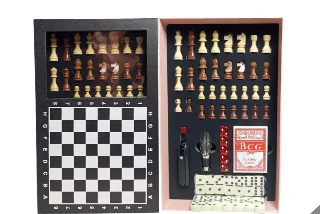 ¡El Set de Vino con juego de ajedrez ,cartas ,Domino es realmente sorprendente! Este set combina lo mejor de ambos mundos: los accesorios necesarios para disfrutar del vino y la emoción estratégica . Además de ser práctico y de alta calidad, este set es un regalo original y memorable. Con una amplia variedad de diseños y presentaciones, podrás elegir el modelo perfecto para impresionar a aquellos conocedores de vino en tu vida. Ya sea para amigos, familiares o cualquier otra persona especial, este set es perfecto para ocasiones como Navidad, Día del Padre o del Maestro. No solo eso, su diseño hermoso y elegante lo convierte en el regalo perfecto para cualquier ocasión, desde cumpleaños hasta bodas y fiestas.