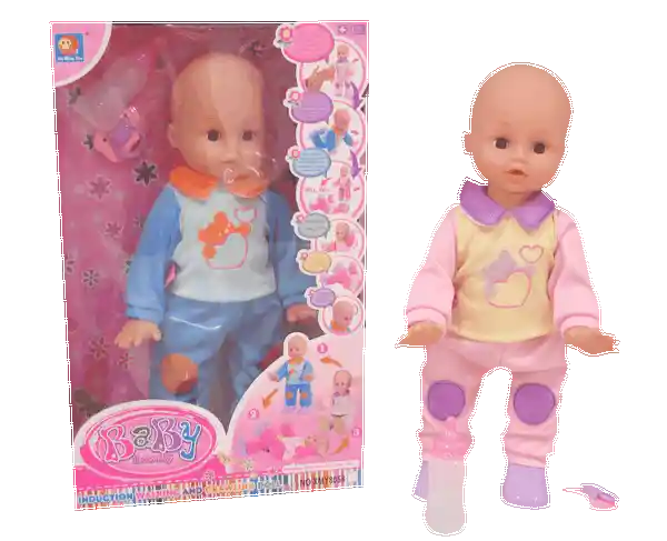 Bebe con mecanismo que gatea camina y cuando llora se tira al piso de espaldas moviendo los brazos y las piernas. Medidas de la caja 42x45cm. Incluye dos baterias AA
