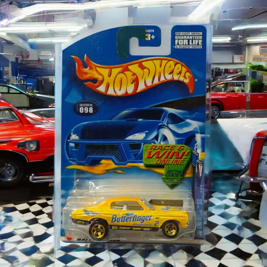 ✅ Lo que sabemos Existe un modelo específico descrito en un sitio de venta: «Hot Wheels 2002 #098 Sweet Rides Series ‘70 Chevelle SS Butterfinger Chevy» — esmalte amarillo, base cromada, interior blanco, tampos “Nestlé Butterfinger 2” en los costados y capó. Ese modelo es de escala 1/64, fabricado en China, serie Sweet Rides de 2002. También hay referencias de la serie “Candy / Butterfinger” de Hot Wheels, por ejemplo: una serie Sugar Rush “Butterfinger” (#744 Mustang Convertible) de 1998.