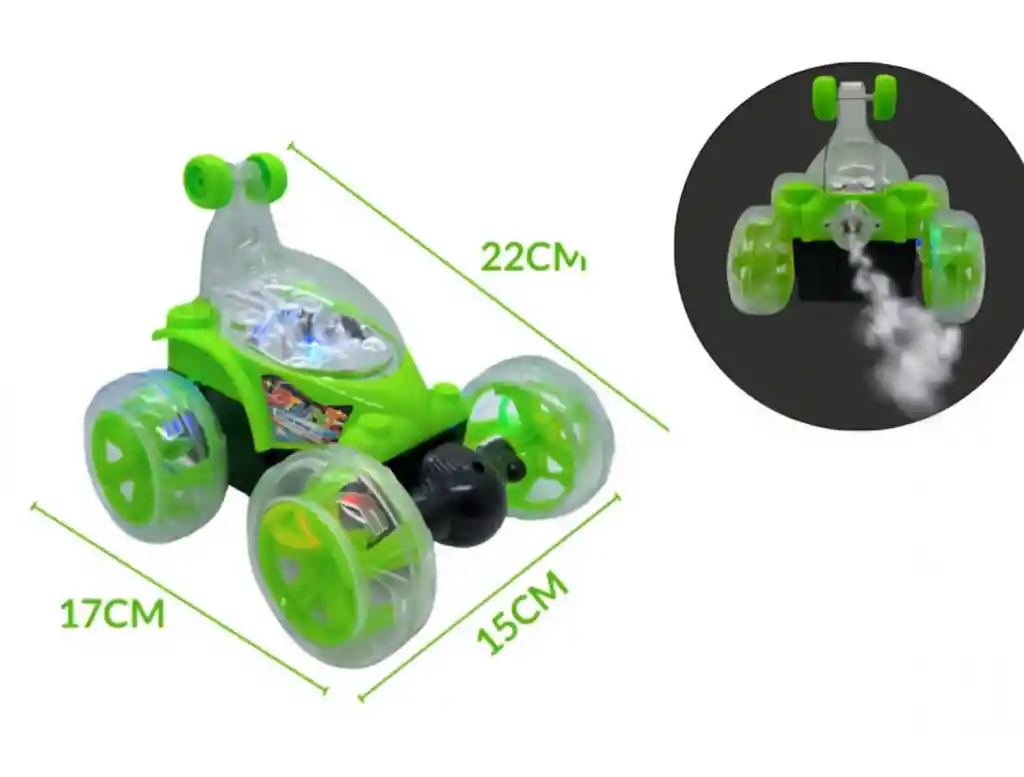 ¡Diversión asegurada! Este increíble carro stunt es perfecto para niños que aman la acción y los efectos especiales. Cuenta con un diseño llamativo en color verde, luces LED que brillan al moverse y ruedas transparentes que giran a toda velocidad. Su función de giros 360°, movimientos acrobáticos y su espectacular efecto de humo real lo hacen un juguete único e impresionante. Medidas aproximadas: Largo: 22 cm Ancho: 17 cm Alto: 15 cm Ideal para regalos, juegos creativos y horas de entretenimiento.