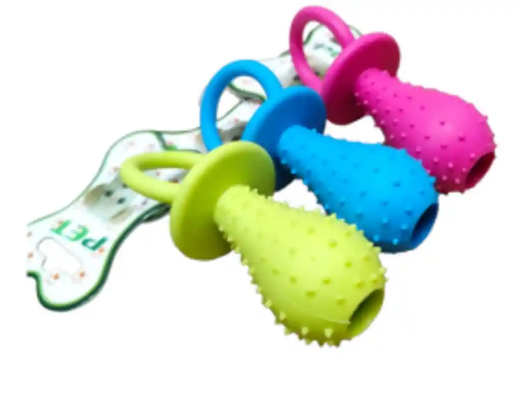 (El chupete para mascotas, también conocido como juguete chupo o mordedor, sirve para varios propósitos. Principalmente, ayuda a calmar y tranquilizar a las mascotas, especialmente mascotas medianas, reduciendo la ansiedad y el estrés. Además, puede actuar como un juguete masticable, lo que contribuye a la salud dental y fortalece la mandíbula).