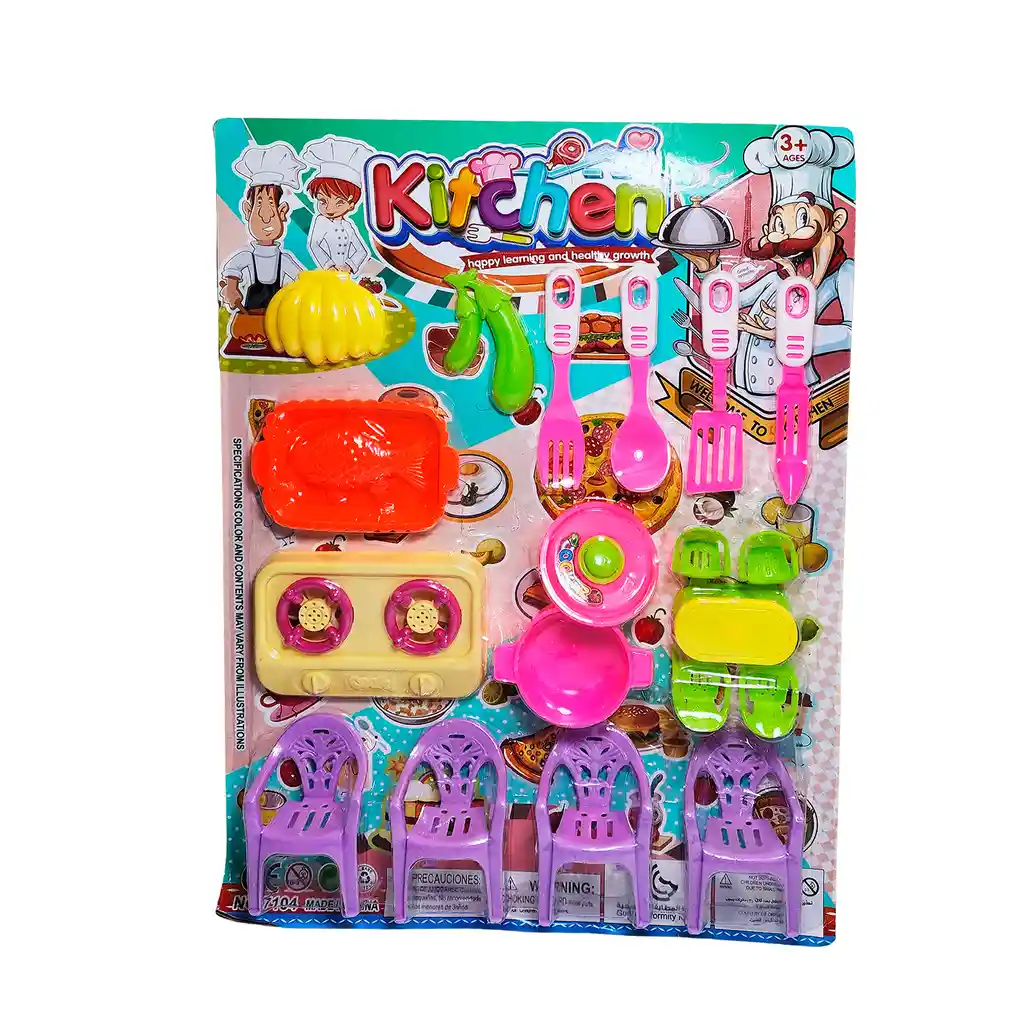 ¡Bienvenido al restaurante más exclusivo de la ciudad, donde tu pequeño chef es la estrella! Con nuestro vibrante Set de Cocina, la imaginación no tiene límites. Este completísimo juego viene con todo lo necesario para preparar y servir un festín inolvidable: una estufa para cocinar los platos más deliciosos, una sartén, una fuente para hornear, coloridas comiditas y todos los utensilios que un gran cocinero necesita. Y lo mejor de todo, cuando la comida está lista, ¡puedes sentar a todos tus invitados en el adorable comedor que incluye una mesa y cuatro sillas! Es el regalo perfecto para inspirar horas de juego de roles, fomentar la creatividad y compartir momentos deliciosamente divertidos. Ficha Técnica: Material : Plástico ABS Edad Apta + 3 años Dimensiones del empaque : 37 cm x 29 cm Referencia: 7104C Certificado de conformidad: E5-0359-2021 ** _Para defectos de fábrica o retractos: \_Por favor revise el producto apenas lo reciba y antes de usarlo. No aplican ley de retracto o defectos de fábrica luego de usar el producto. Se manejan máximo 5 días para reportar defectos de fábrica (por ejemplo, producto funciona mal, piezas faltantes, rotas, etc). Para hacer efectiva la devolución el producto debe devolverse con el empaque original, el cual debe estar en buen estado, incluir todos los documentos y las partes completas y sin daños.