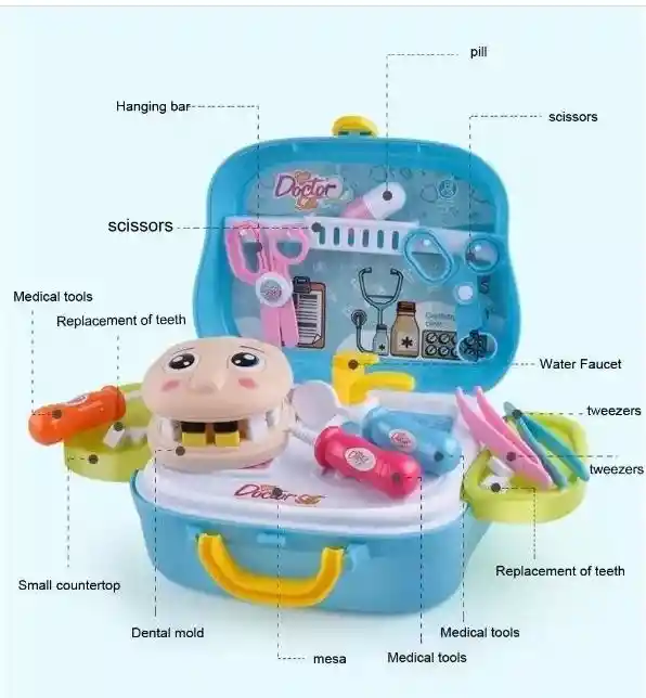 Kit de odontólogo con múltiples elementos para recrear y acercarse a este maravilloso mundo de profesiones. Al abrir el morral encontrarás distintos elementos (Ver fotografías). Los juegos de rol permiten a los niños conocer y entender el mundo, desarrollar el lenguaje, compartir con otros de su edad. Son ideales para niños en edad preescolar. Dimensiones del producto: 23 cm x 21 cm
