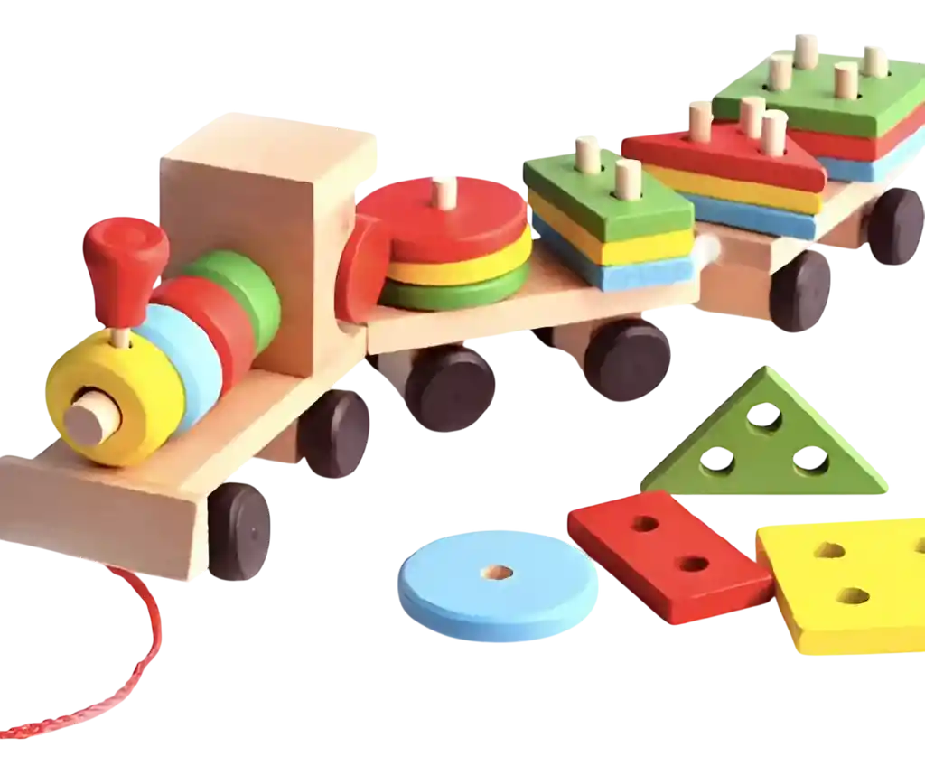 Juego Didáctico Trenes Bloques Este Hermoso Juguete consiste en un tren y dos vagones hechos totalmente en madera, cada uno de ellos cuenta con ruedas deslizables y una superficie donde podrás acomodar piezas de diferentes formas geométricas y colores, ademas podrás engancharlos y tirar de ellos con una cuerda que trae en el tren principal. Permite desarrollar habilidades de motricidad, coordinación mano-visión y aprendizaje de colores. Estimula el pensamiento y resolución de problemas, acción y reacción. Gracias a su arrastre permite estimular el gateo en los mas pequeños.
